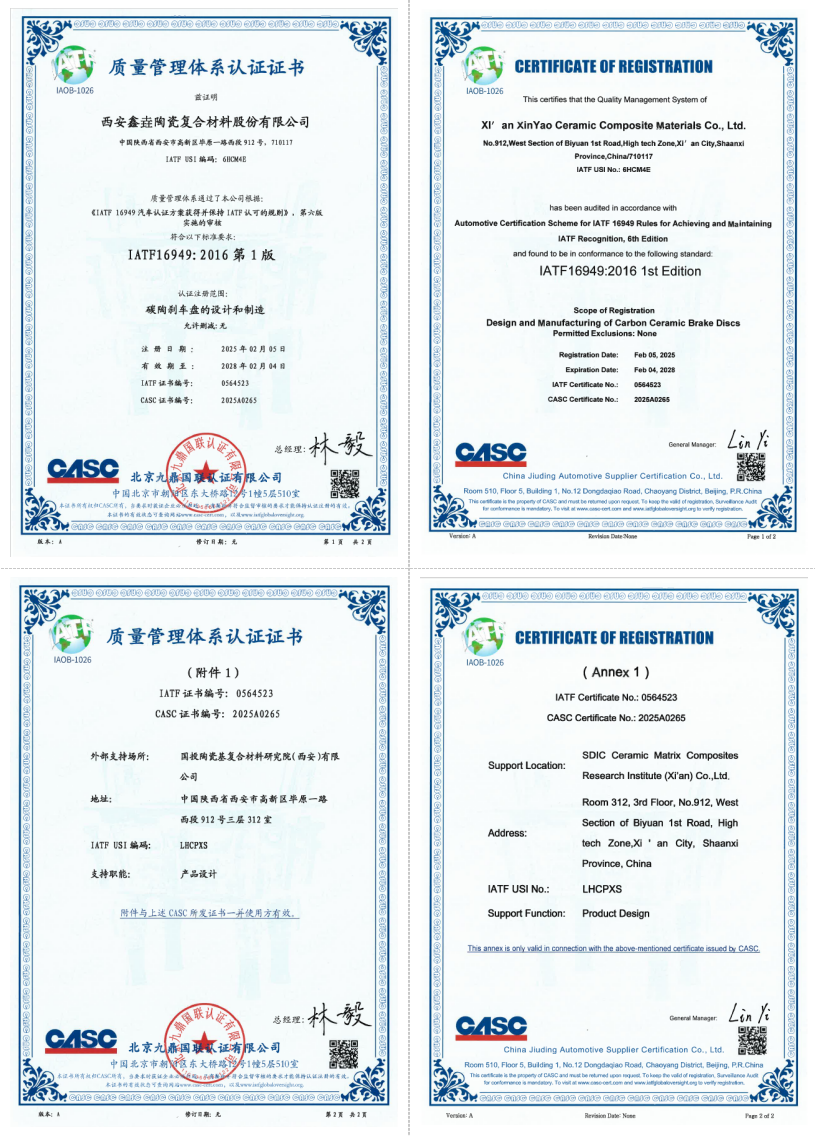 近日,西安鑫垚陶瓷復合材料股份有限公司收到了北京九鼎國聯認證有限公司下發的IATF 16949汽車質量管理體系認證證書,認證注冊范圍為“碳陶剎車盤的設計和制造”,外部支持場所為“國投陶瓷基復合材料研究院(西安)有限公司”。這標志著公司在汽車行業質量管理領域達到了國際認可標準,為公司在汽車產業供應鏈中贏得了更廣闊的發展空間。